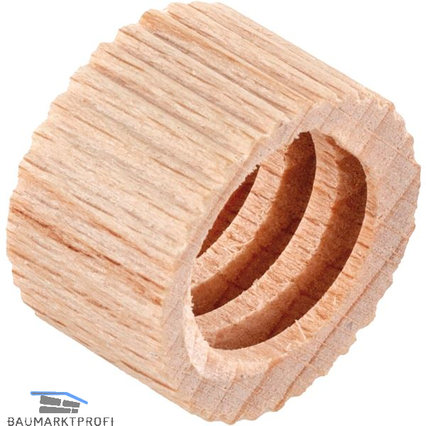 Mutter rund (geriffelt), Format: DM 20x12mm, Gewinde DM 15mmZu rund 90% werden die Muttern aus Buchenholz gefertigt.Je nach Verfügbarkeit kann auch Ahorn verwendet werden.