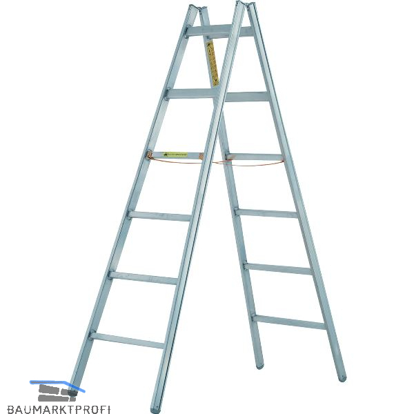 Stehleiter aus doppelwandigem Profil, starke Aluminiumgelenke. Die obersten zwei Sprossen bestehen aus Ovalrohr mit 320 mm Sprossenabstand für bequemen Stand in der Grätsche, reißfeste Gurtbänder als Spreizsicherung. Sprossenabstand 300 mm. Tragkraft 150 kg.