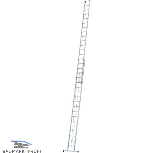 Alu-Schiebeleiter 2-teilig mit Seilzug. Höhenfixierung durch vollautomatische Stahlhaken, kunststoffummantelt. Führungsklammer in extra starker Ausführung unten und oben, griffiges Kunststoffseil rundumlaufend. Bedienerfreundliche Mauerrollen am oberen Ende des Schiebeteils, starke Vollgummischuhe für sicheren Stand. Ab Größe 2 x 22 zusätzliche Stützen erforderlich.Tragkraft 150 kg.