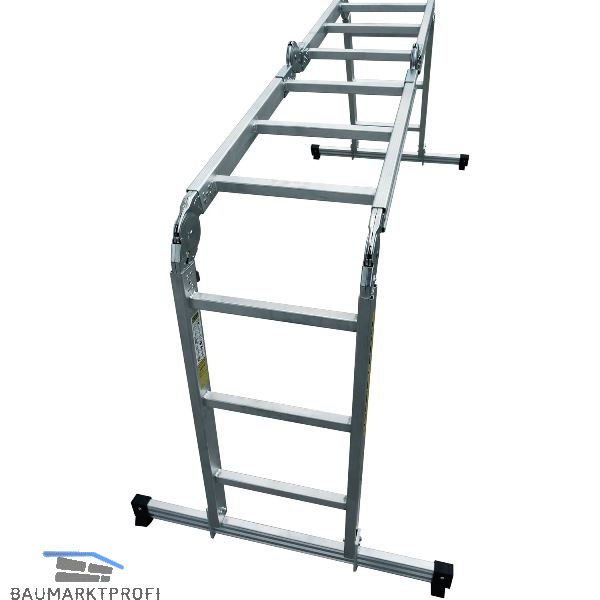 Aluminium Vielzweckleiter verwendbar als Anlegeleiter, Doppelleiter, oder als Arbeitsbock, speziell, verzinkte, einrastende Stahlgelenke, rutschhemmende Sprossen, rutschhemmende Kunststoffschuhe unten und oben, beidseitige Standverbreiterung durch konisch ausgeführte Leiterenden. Tragkraft 150 kg.