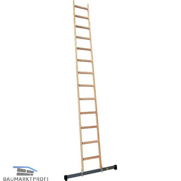 Aus handselektierten Nadelholzholmen, Sprossen aus Hartholz, verleimte Doppelkeilverbindungen zwischen Holmen und Sprossen, imprägniert, Leiterbreite außen ca. 390 mm. Tragkraft 150 kg.