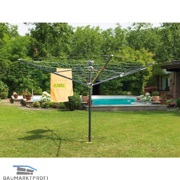 Öffnen ohne Bücken mit dem Handgriff am Wäschespinnenarm. Durch sanftes Ziehen des roten Griffes öffnet sich die Wäschespinne langsam, aber kraftvoll von selbst, um die 51,5 m umfassende Wäscheleine gleichmäßig aufzuspannen. Der obere rote Griff ermöglicht es dabei, die Wäschespinne auf der komfortabelsten Höhe von 165 bis 190 cm zu fixieren. Die eingebaute Schutzhülle wird über der geschlossenen Wäschespinne fixiert. Verwindungssteife Alu-Doppelkastenprofilarme. Leinenklemmen - für immer gespannte Leinen. Eindreh-Bodenhülse mit Eindrehwerkzeug. UV- und witterungsbeständige Kunststoffteile, TWARON Wäscheleine. 55 mm Alustandrohr.