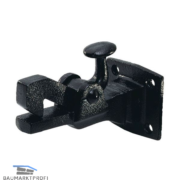 Zum Arretieren wird das Tor gegen den Feststeller gedrückt. Der Fanghaken rastet am Haltewinkel ein und bewirkt die Feststellung des Tores. Ein Betätigen des Fanghakens gibt das Tor wieder frei.