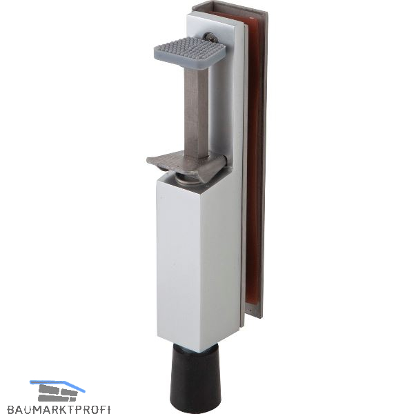 Die Tür kann in jedem Öffnungswinkel festgestellt werden. Zum Feststellen wird der Tretbolzen so weit heruntergedrückt bis der Stopfen sich auf dem Boden festgepresst hat. Ein leichter Druck auf die Sperrplatte gibt die Tür wieder frei. Der Abstand von Unterkante der Tür bis Stopfen soll 5 - 10 mm betragen. Zur Befestigung des Türpuffers sind keine Bohrlöcher im Glas erforderlich. Eine serienmäßig montierte Konterfeder erhöht den Anpressdruck auf dem Boden.