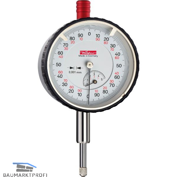Robustes Metallgehäuse, Einspannschaft-Ø 8 h 6, Umlaufzähler, Toleranzmarken, Außenring -Ø 58 mm, 1 Zeigerumdrehung = 0,2 mm. Messbolzen sowie Einspannschaft sind aus widerstandsfähigem nichtrostendem Stahl, nach DIN EN ISO 463. Werksnorm.