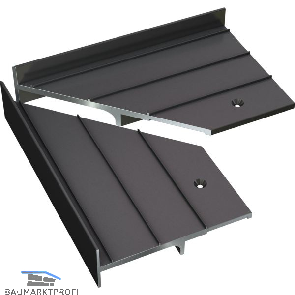 Zweiteilige Eck-Fixierung der Platten. Der 5 mm starke Eckwinkel verhindert die Kippbewegung der in der Terrassenecke platzierten Platte bei Kantenbelastung. Er hat die gleiche Tiefe wie der Terrassenlagerfuß, der deshalb beim Wandanschluss nicht eingekürzt werden muss.