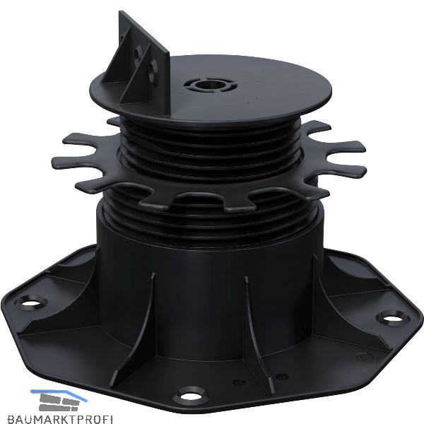 Das Anschrauben der Unterkonstruktion am seitlichen Steg bietet einen sicheren Halt und ermöglicht, mithilfe des Doppelgewindes, eine komfortable Höhenverstellung welche durch einfaches Links- / Rechtsdrehen herbeigeführt wird. Durch das Anschrauben der Untergrundkonstruktion bieten die Verstellfüße einen sicheren Stand der gesamten Konstruktion und das Erstellen des Gefälles ist wesentlich vereinfacht, den beim Bau einer Terrasse ist das Errichten der Unterkonstruktion sehr zeitintensiv, vor allem wenn geeignete Aufstellflächen für Terrassenlager (wie z.B. Betonplatten) aufwendig ausgerichtet werden müssen. Dieses Problem lösten das Terrassenlager, indem es durch seinem beweglichen Kopf ein Gefälle dieser Flächen von bis zu 8 % ausgleicht.
