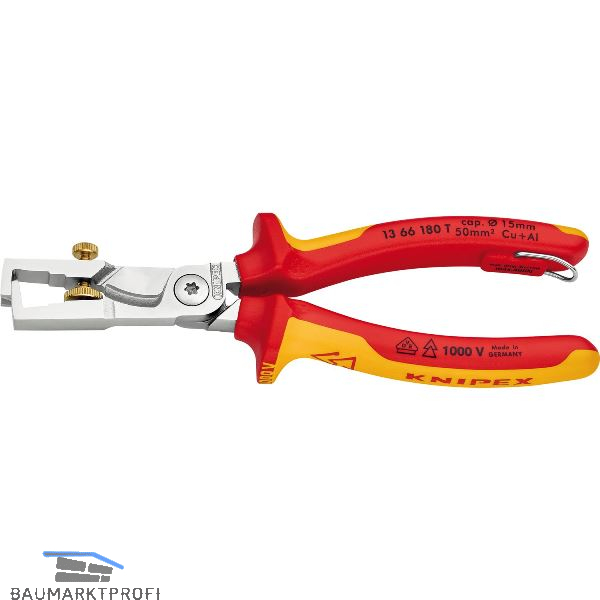 Für ein-, mehr- und feindrähtige Leiter mit Kunststoff- oder Gummiisolation. Abstufung in der Backe als optische Orientierungshilfe zum Abisolieren konstanter Längen (11 mm und 16 mm). Einfache Verstellung auf den gewünschten Draht- oder Litzendurchmesser durch Rändelschraube und Kontermutter. Scherschneide zum Schneiden von Cu- und Al-Kabeln bis Ø 15 mm (5 x 2,5 mm²). Schlanke Bauform für gute Zugänglichkeit. Geschraubtes Gelenk: präziser, spielfreier Gang der Zange.