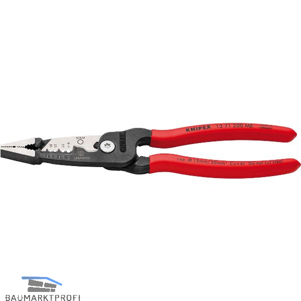 Großer Kapazitätsbereich, scharf geschliffene Abisolierprofile und intuitives Positionieren. Leichteres Schneiden insbesondere von Flachkabeln durch Innovative Schneidengeometrie. So flach wie eine Spitzzange, so breit wie eine Kombizange für hohe Stabilität bei guter Zugänglichkeit. Präzise geschliffene Abisolierprofile für massive Leiter von 0,75 – 6 mm² und feindrähtige Leiter von 0,5 – 4 mm². Zielsicheres Positionieren des Leiters durch Positionierstege. Leichtes Schneiden von mehradrigen Kupfer- und Aluminiumkabeln bis Ø 15 mm (1/2"). Breite, kreuzverzahnte Greifflächen zum Verdrillen von Adern. Gefräste Nut für sicheres Halten und Ziehen kleiner Werkstücke wie z.B. Nägel. Einseitig konvexe Greiffläche zum sicheren Greifen von Flachmaterial und Brennerloch zum Greifen von Rundmaterial. Markante Außenkante zum Entgraten von Leerrohren.