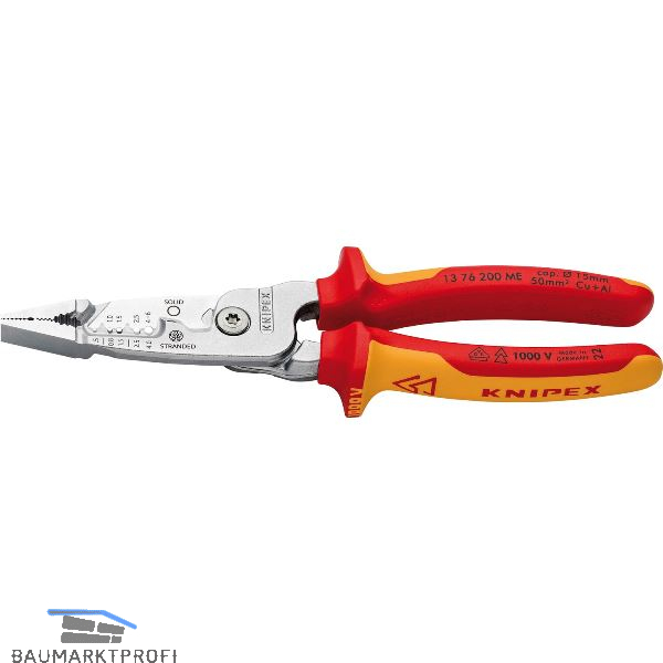 Großer Kapazitätsbereich, scharf geschliffene Abisolierprofile und intuitives Positionieren. Leichteres Schneiden insbesondere von Flachkabeln durch Innovative Schneidengeometrie. So flach wie eine Spitzzange, so breit wie eine Kombizange für hohe Stabilität bei guter Zugänglichkeit. Präzise geschliffene Abisolierprofile für massive Leiter von 0,75 – 6 mm² und feindrähtige Leiter von 0,5 – 4 mm². Zielsicheres Positionieren des Leiters durch Positionierstege. Leichtes Schneiden von mehradrigen Kupfer- und Aluminiumkabeln bis Ø 15 mm (1/2"). Breite, kreuzverzahnte Greifflächen zum Verdrillen von Adern. Gefräste Nut für sicheres Halten und Ziehen kleiner Werkstücke wie z.B. Nägel. Einseitig konvexe Greiffläche zum sicheren Greifen von Flachmaterial und Brennerloch zum Greifen von Rundmaterial. Markante Außenkante zum Entgraten von Leerrohren.