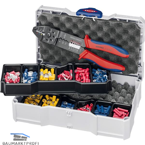 Gebräuchliches Crimpsortiment im TANOS MINI-Systainer (stabile Kunststoffbox). Mit T-Loc-Verschluss für Einhandbedienung: mit einem Dreh den Systainer öffnen oder schließen und mit einem zweiten Systainer verbinden. Öffnen im verknüpften Zustand: Einfach und schnell auf die Inhalte zugreifen, ohne die Verbindung zu lösen. Mit zwei stapelbaren Kunststoffeinsätzen mit je sechs Mulden.
