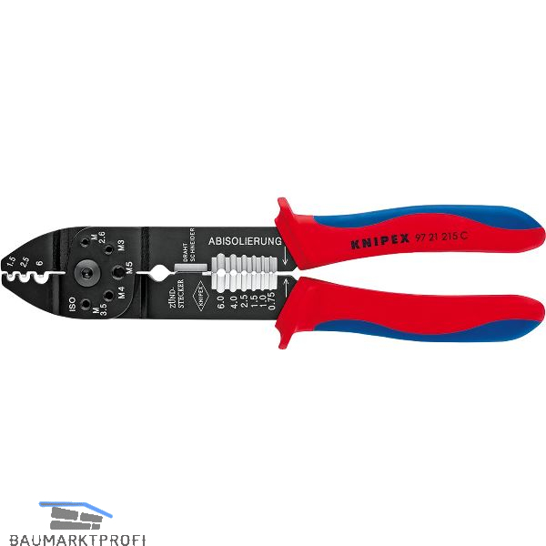 Zum Kabelschneiden, Abisolieren von Drähten und Crimpen von isolierten und unisolierten Kabelschuhen, Steckverbindern und offenen Steckverbindern. Mit Gewindelöchern zum Abschneiden von Cu- oder Ms-Gewindestiften mit M 2,6; M 3; M 3,5; M 4 und M 5. Geschraubtes Gelenk für eine hohe Stabilität und gleichmäßigen Lauf.
