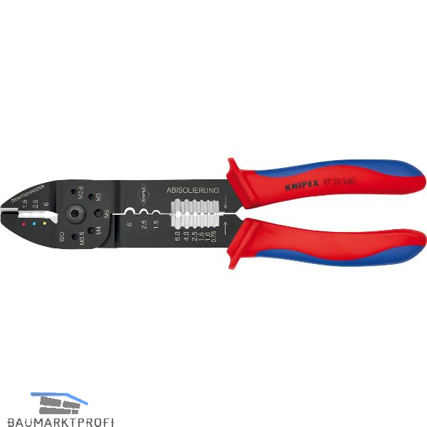 Zum Kabelschneiden, Abisolieren von Drähten und Crimpen von isolierten und unisolierten Kabelschuhen, Steckverbindern und offenen Steckverbindern. Mit Gewindelöchern zum Abschneiden von Cu- oder Ms-Gewindestiften mit M 2,6; M 3; M 3,5; M 4 und M 5. Geschraubtes Gelenk für eine hohe Stabilität und gleichmäßigen Lauf.