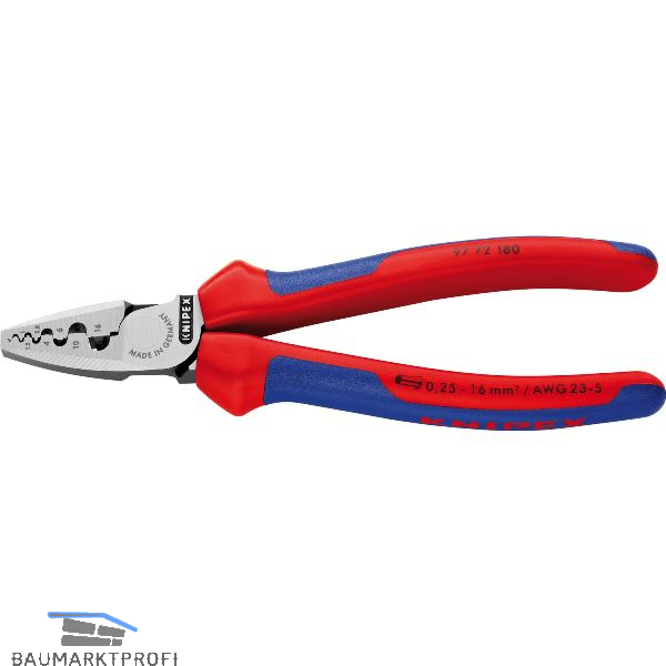 Zum Verpressen von Aderendhülsen nach DIN 46228 Teil 1 + 4 im Bereich von 0,25 bis 16 mm². Verpressung in gekennzeichneten Halbrundprofilen für die sichere Verbindung von Hülse und Leiter. Besonders tiefe Profile mit konischen Seitenflächen. Leichtes Crimpen durch optimierte Übersetzung. Leichte und schlanke Bauweise.