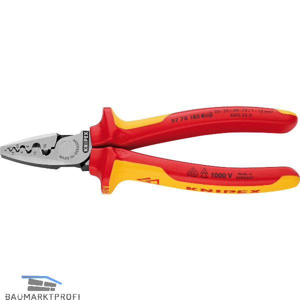 Zum Verpressen von Aderendhülsen nach DIN 46228 Teil 1 + 4 im Bereich von 0,25 bis 16 mm². Verpressung in gekennzeichneten Halbrundprofilen für die sichere Verbindung von Hülse und Leiter. Besonders tiefe Profile mit konischen Seitenflächen. Leichtes Crimpen durch optimierte Übersetzung. Leichte und schlanke Bauweise.