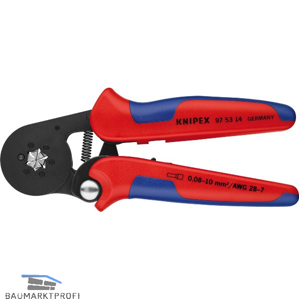 Zum Verpressen von Aderendhülsen nach DIN 46228 Teil 1 + 4. Selbsteinstellende Anpassung auf die gewünschte Aderendhülsengröße: keine Crimpfehler durch Verwendung des falschen Crimpeinsatzes. Seitliche Einführung der Aderendhülsen in das Werkzeug. Gleichbleibend hohe Crimpqualität durch Zwangssperre (entriegelbar). Crimpdruck ist werkseitig präzise eingestellt (kalibriert), nachstellbar. Kraftverstärkung durch Kniehebel für ermüdungsarmes Arbeiten. Hoher Bedienkomfort durch handliche Bauform, geringes Gewicht und geringere Griffweite. Mit Öffnungsfeder.