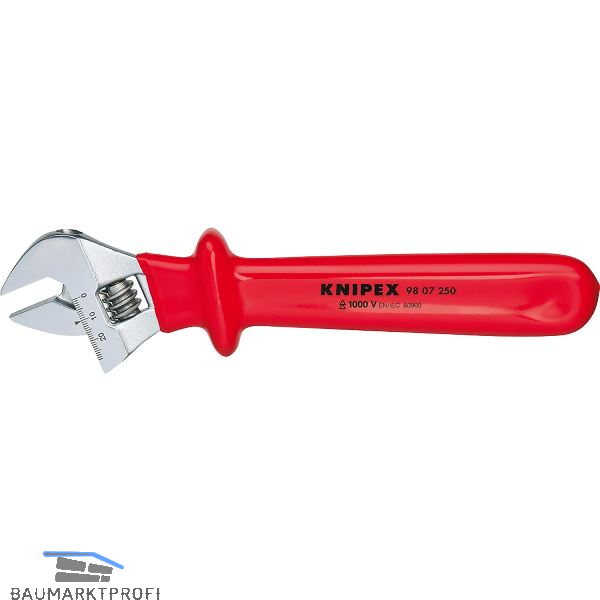22° gewinkelte, parallel geführte, glatte Greifbacken. Schlüsselweite stufenlos einstellbar. Mit Skalierung zur Einstellung der Schlüsselweite abseits vom Werkstück. Isoliert nach DIN EN/IEC 60900 bis 1000V.