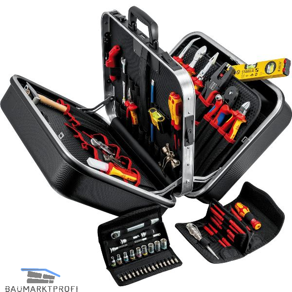 Strapazierfähige Ausführung aus ABS-Material, Farbe schwarz. Bestückt mit 63 Markenwerkzeugen, teilweise VDE-geprüft nach DIN EN/IEC 60900. Umlaufender Aluminium-Rahmen und fest montierte, stabile, beidseitig bestückbare Mittelwand mit vielseitigen Einsteckmöglichkeiten durch elastische Schlaufen und 12 kleine Taschen.