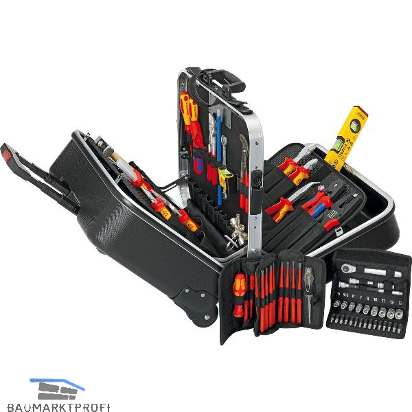 Strapazierfähige Ausführung aus ABS-Material, Farbe schwarz. Bestückt mit 63 Markenwerkzeugen, teilweise VDE-geprüft nach DIN EN/IEC 60900. Umlaufender Aluminium-Rahmen und fest montierte, stabile, beidseitig bestückbare Mittelwand mit vielseitigen Einsteckmöglichkeiten durch elastische Schlaufen und 12 kleine Taschen. Im Boden eingelassener Ausziehgriff sowie zwei außen liegende, leicht laufende Skater-Rollen.