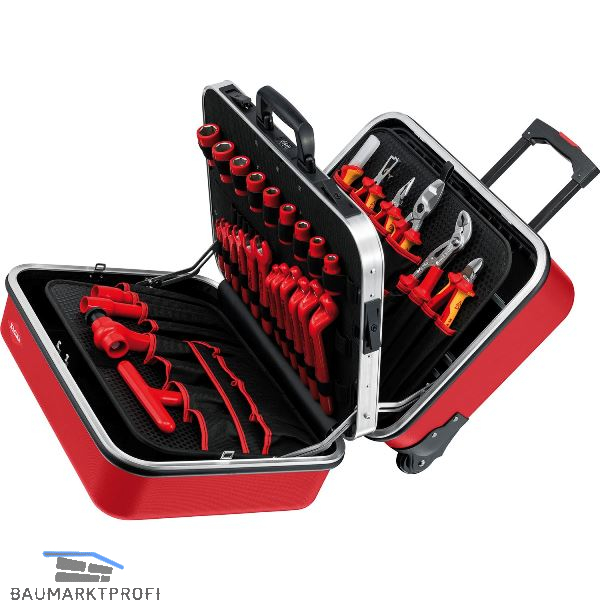 Strapazierfähige Ausführung aus ABS-Material, Farbe rot. Bestückt mit 74 isolierte Markenwerkzeuge, teilweise VDE-geprüft, für Arbeiten an elektrischen Anlagen, geprüft nach DIN EN/IEC 60900.