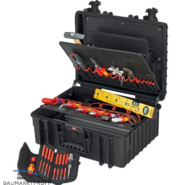 Flugtauglicher Koffer aus schlagfestem Polypropylen. Bestückt mit 26 Markenwerkzeugen, teilweise VDE-geprüft nach DIN EN/IEC 60900. Staub- und wasserdicht. Automatisches Druckausgleichventil. Vorrichtung für Vorhängeschloss. Dokumentenfach und Werkzeugtafeln aus Con-Pearl® mit 42 bestückbaren Werkzeugtaschen und 67 Werkzeugschlaufen. Verschließbare Bodenschale individuell unterteilbar durch Aluminium-Trennstegesystem. Ergonomischer Zweikomponenten-Griff. Temperaturstabil von - 30°C bis + 80°C.