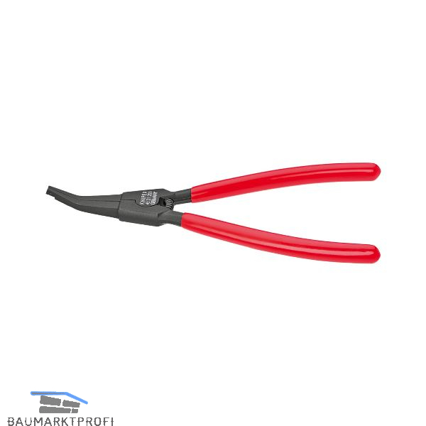 Gebogene Backen mit Zentrierung, zur Montage von Spreng-und Sicherungsringen ohne Greiflöcher, für Sprengringe nach Norm ab Ø 12,0 mm, Mindestöffnung der Ringe 2,2 mm, mit Öffnungsfeder, geschmiedet und in Öl gehärtet und angelassen, Kopf brüniert, Griffe mit Kunststoff überzogen.