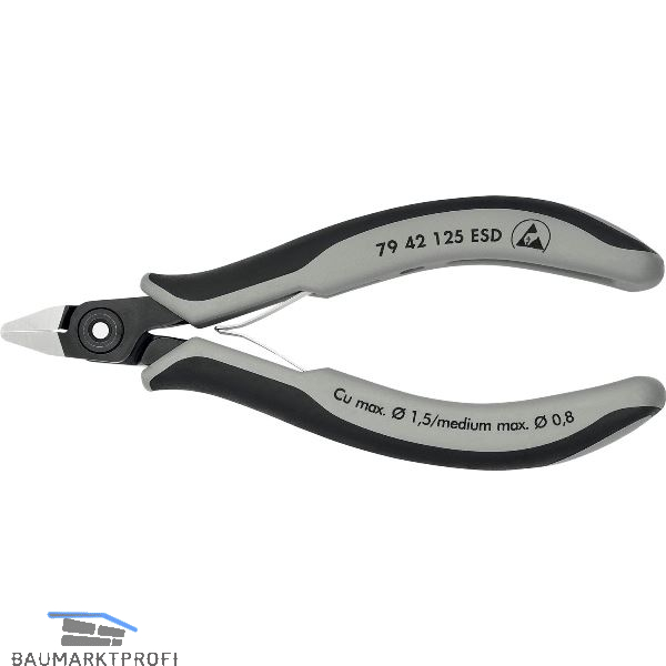 Präzisionszangen für feinste Schneidarbeiten, z. B. in Elektronik und Feinmechanik. Sehr genau geschliffene, scharfe Schneiden für exakte Schnitte an empfindlichen Elektronik-Bauteilen. Schneiden zusätzlich induktiv gehärtet. Schneidenhärte ca. 64 HRC. Ca. 20 % weniger Gewicht als konventionelle Elektronikzangen. Geschraubtes Gelenk mit besonders sorgfältig gefertigten Gelenkflächen für gleichmäßige, reibungsarme Bewegung im gesamten Öffnungsbereich. Leichtgängige Doppelfeder für ein sanftes und gleichmäßiges Öffnen.