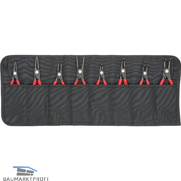 Gängige Präzisions-Sicherungsringzangen für Innen- und Außenringe. In Rolltasche aus strapazierfähigem Polyester-Gewebe, mit praktischem verstellbarem Schnellverschluss.