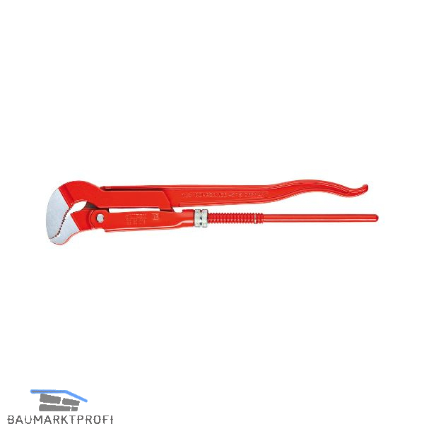 Hergestellt aus Chrom-Vanadin-Stahl, in Öl gehärtet und angelassen, geschmiedet, Backen blank geschliffen und rot pulverlackiert, Stellmutter, Doppel- T-Profilgriff. Verzahnung zusätzlich induktiv gehärtet und gegen die Drehrichtung versetzt, schlankes S-förmiges Maul, 45º abgewinkelt.