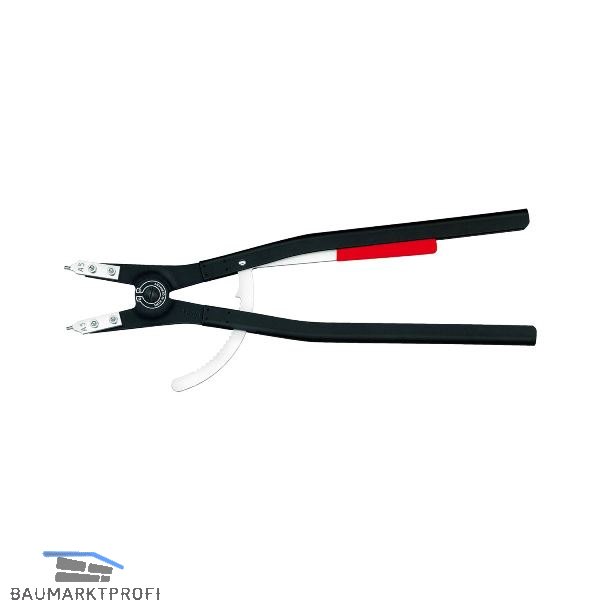 Zur Montage von Sicherungsringen auf Wellen, mit lösbarem Sperrmechanismus und auswechselbaren geraden Spitzen, schwarz pulverlackiert, Zangenkörper aus hochfestem Walzstahl, Spitzen aus Spezial-Werkzeugstahl, ölgehärtet. Mit geschraubtem Gelenk.