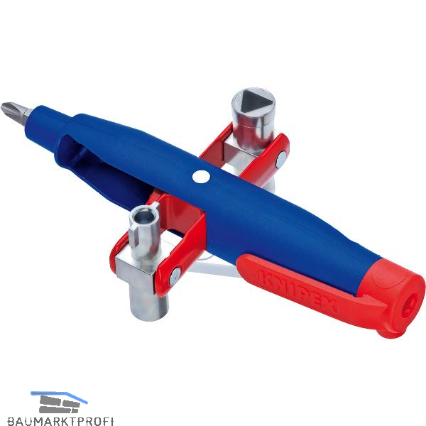 Transportfreundlicher Schaltschrank-Schlüssel in Kugelschreiberform mit Befestigungsclip zur sicheren Aufbewahrung. Durch Ausschwenken des Schlüsselträgers können vier verschiedene