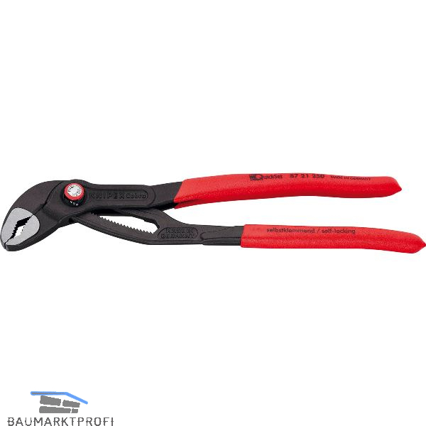 Die Cobra® QuickSet vereint alle bewährten Eigenschaften der KNIPEX Cobra® mit einer zusätzlichen Schiebefunktion, die das Arbeiten in sehr engen und unzugänglichen Arbeitsbereichen erleichtert. Die Einstellung direkt am Werkstück kann durch einfaches Zuschieben der Zangenschenkel erfolgen. Bei der ersten Belastung rastet der Gelenkbolzen ein. Danach ist die Griffweite der Zange fixiert und kann nur durch erneutes Drücken des Knopfes verstellt werden. Um die Schiebefunktion erneut zu aktivieren, wird der Gelenkbolzen per Knopfdruck ausgedrückt und die Zange einmal ganz geöffnet.