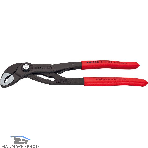 Die Cobra® matic vereint alle bewährten Eigenschaften der KNIPEX Cobra® mit einer zusätzlichen automatischen Einstellung per Knopfdruck direkt am Werkstück. Durch die geschützt liegende Feder schnellt die Zange bei Betätigung des Druckknopfes (Einhandbedienung!) selbsttätig zu. Mit Öffnungsfeder.