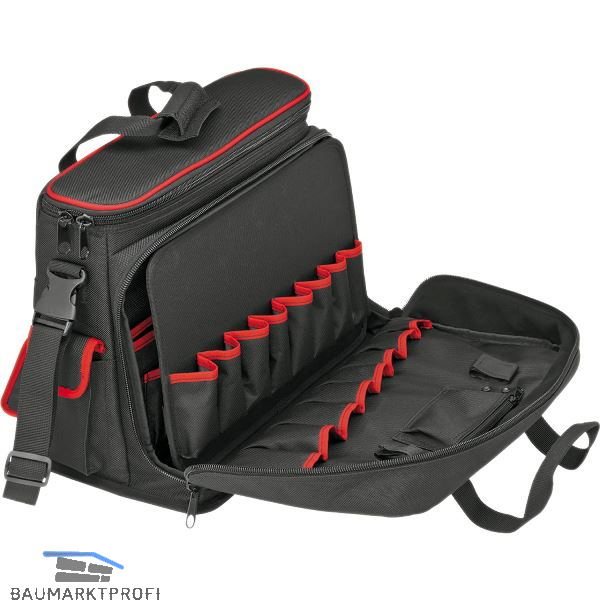 Für Servicetechniker. Gefütterte Innentasche für Notebook und DIN A4 Dokumente; zusätzlich 1 DIN A4 Reißverschlussfach. 90° aufklappbare Vordertasche mit 8 Werkzeugtaschen und 1 kleinen Innentasche. Rückseite der Vordertasche mit 5 Werkzeugtaschen und 3 Stifttaschen. 1 herausnehmbare Werkzeugtafel mit 8 Werkzeugtaschen auf der Vorderseite und 2 Reihen elastischer Schlaufen auf der Rückseite. Spritzwassergeschützter Boden. Verstellbarer Schultergurt mit Schnellverschluss. Mit zwei Trageschlaufen, aus strapazierfähigem Polyester-Gewebe.