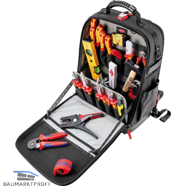 Praktisch und bequem dank komplett aufklappbarer Vorder- und Rückseite, herausnehmbarer Werkzeugtafel und ergonomischer Rückenpolsterung. Optimale Flexibilität dank innovativen FIDLOCK®-Adaptern und MOLLE-Bändern. Mit zwei separaten Innenfächern für Werkzeug, Messgeräte, Notebook oder Tablet. Widerstandsfähiges Gewebe aus nachhaltigen Recycling-Kunstfasern, spritzwassergeschützt und leicht zu reinigen. Wasserdichte Bodenschale aus schlagfestem Kunststoff für stabilen Stand im geöffneten und geschlossenen Zustand, 6 cm hoch. Innen ein und außen vier MOLLE-Bänder zur Befestigung von beliebigen Adaptern, Karabinern, Zubehör je nach Bedarf. Mit insgesamt 21 Haltelaschen und 37 Taschen, teilweise mit Reißverschlüssen. Mit Kofferlasche zur Fixierung an Teleskopgriffen von Werkzeugkoffern. Geprüfte Belastbarkeit bis 15 kg Werkzeuggewicht. Bestückt mit 16 Knipex und insgesamt 22 Markenwerkzeugen. Maximale Zuladung: 15kg.