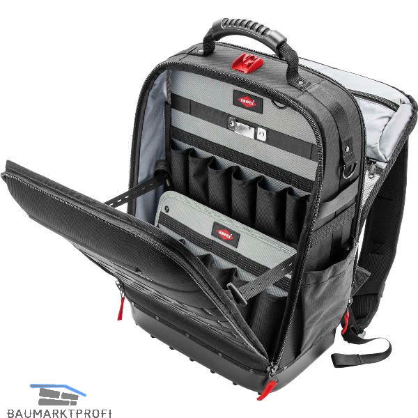 Praktisch und bequem dank komplett aufklappbarer Vorder- und Rückseite, herausnehmbarer Werkzeugtafel und ergonomischer Rückenpolsterung. Optimale Flexibilität dank innovativen FIDLOCK®-Adaptern und MOLLE-Bändern. Mit zwei separaten Innenfächern für Werkzeug, Messgeräte, Notebook oder Tablet. Widerstandsfähiges Gewebe aus nachhaltigen Recycling-Kunstfasern, spritzwassergeschützt und leicht zu reinigen. Wasserdichte Bodenschale aus schlagfestem Kunststoff für stabilen Stand im geöffneten und geschlossenen Zustand, 6 cm hoch. Innen ein und außen vier MOLLE-Bänder zur Befestigung von beliebigen Adaptern, Karabinern, Zubehör je nach Bedarf. Mit insgesamt 21 Haltelaschen und 37 Taschen, teilweise mit Reißverschlüssen. Mit Kofferlasche zur Fixierung an Teleskopgriffen von Werkzeugkoffern. Geprüfte Belastbarkeit bis 15 kg Werkzeuggewicht.