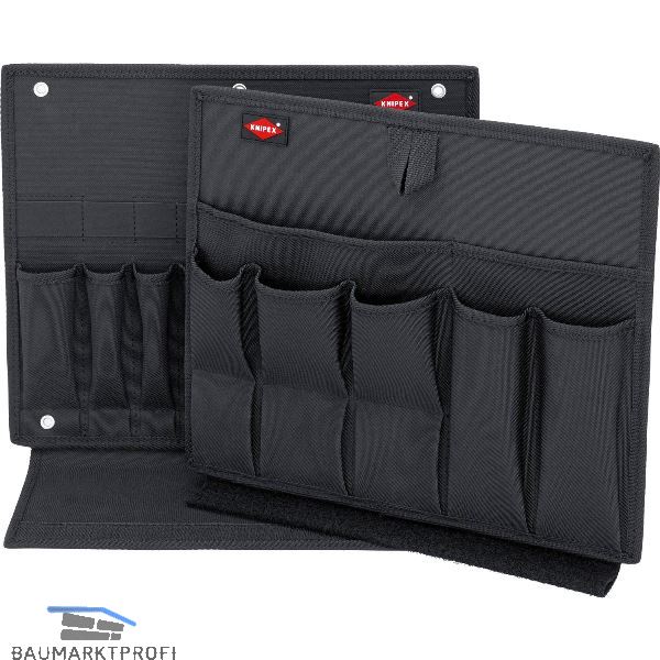 Zweiteilige Werkzeugkarte aus strapazierfähigem Polyester-Gewebe. Werkzeugkarten sind über Klett miteinander verbunden. Obere Werkzeugkarte (Deckelteil) mit 10 Taschen und 10 elastischen Schlaufen. Die obere Werkzeugkarte wird mit dem Deckel der KNIPEX L-BOXX® verschraubt. Untere Werkzeugkarte (Bodenteil) oben mit 7 Taschen und Lasche zum Aufhängen der Werkzeugkarte, dient auch zum Anheben oder Aufstellen in der KNIPEX L-BOXX®. Bodenteil unten mit 7 Taschen und 7 elastischen Schlaufen. Untere Werkzeugkarte kann bei Bedarf aus der KNIPEX L-BOXX® entnommen werden.