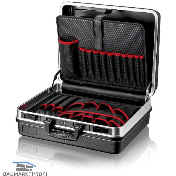 Strapazierfähige Ausführung aus ABS-Material, Farbe schwarz. Umlaufender Aluminiumrahmen mit D-Ringen zum Anbringen des beiliegenden Trageriemens. 3-stelliges Zahlenschloss und zwei Kippschlösser zur Fixierung des Deckels. Stabiler, ergonomischer Tragegriff. Metallscharniere. Deckelhalter mit Scharniermechanik. Dokumentenfach und herausnehmbare Werkzeugtafel im Deckel mit neun Werkzeugtaschen und einer elastischen Schlaufe auf der Deckelseite. Zehn schmale und eine großen Werkzeugtasche auf der Bodenseite. Bodenschale Höhe 55 mm, durch Einsätze weiter unterteilbar und Abdecktafel mit 12 großen Werkzeugtaschen und ein Flachfach, per Druckknopf fixierbar. Belastbarkeit: 15 kg.