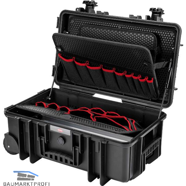 Für härteste Einsatzbedingungen – schlagfestes Polypropylen, Staub-, wasserdicht und temperaturbeständig. Maximale Flexibilität dank 19 Werkzeugtaschen und 61 Halteschlaufen sowie anpassbarem Aluminium-Trennstegesystem. Flugtauglich, mit ausfahrbarem, ergonomischen Haltegriff und leichtlaufenden Rollen für mehr Komfort. Staub- und wasserdicht. Automatisches Druckausgleichventil. Temperaturstabil von -30°C bis +80°C. Vorrichtung für Vorhängeschloss. Dokumentenfach. Werkzeugtafeln aus schmutzabweisenden PP-Hohlkammerplatten mit bestückbaren Werkzeugtaschen und -schlaufen. Verschließbare Bodenschale individuell unterteilbar durch Aluminium-Trennstegesystem. Ergonomischer Zweikomponenten-Griff.