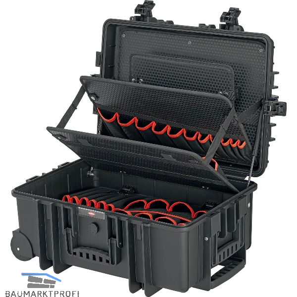 Mit 54 bestückbaren Werkzeugtaschen und 94 Werkzeugschlaufen. Verschließbare Bodenschale individuell unterteilbar durch Aluminium-Trennstegesystem. Ergonomischer Zweikomponenten-Griff. Mit zwei leicht laufenden Rollen und Teleskopgriff. Temperaturstabil von - 30°C bis + 80°C. Volumen: 45 l. Belastbarkeit bis 35 kg.