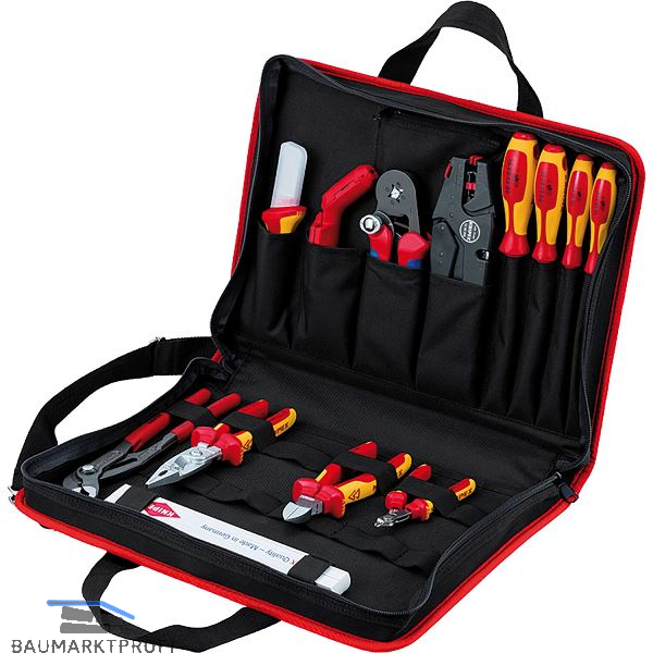 Lieferung inkl. Seitenschneider, Cobra, Hightech-Wasserpumpenzange, Electronic Super Knips, selbsteinstellende Crimpzange für Aderendhülsen, mit Seiteneinführung, Kabelmesser, ErgoStrip, Universal-Abmantelungswerkzeug, selbsteinstellende Abisolierzange, Elektro-Installationszange, Schraubendreher (Slim) für Schlitzschrauben, Schraubendreher (Slim) für Kreuzschlitzschrauben Pozidriv, Schraubendreher (Slim) für Kreuzschlitzschrauben Pozidriv, Schraubendreher (Slim) für Kreuzschlitzschrauben Phillips.