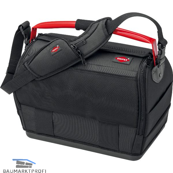 Beidseitig zu öffnen. Aus strapazierfähigem Polyester-Gewebe. Mit Reissverschlüssen und Klettverschluß. Werkzeugschlaufen an den Innenseiten. Bodenschale aus Kunststoff. Tragegriff aus Stahl mit Softgrip. Schultergurt (auch als Werkzeuggürtel verwendbar) mit Kleintasche für Mobiltelefon.