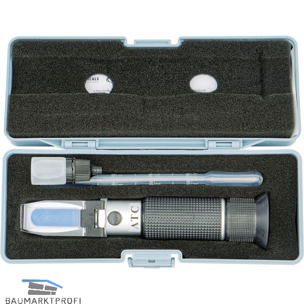 Mittels Handrefraktometer HRF 20 lässt sich der Wasseranteil in Kühlschmierstoffen überprüfen. Das Handrefraktometer HRF 20 ist ein optisches Präzisionsinstrument zur Messung des Brixwertes im Bereich 0 - 20% mit einer Teilung 0,1%. Einsatzgebiet: Kühlschmierstoffe, speziell Schleifemulsionen. Das Gerät ist für sehr geringe Probemengen geeignet und durch die kleine und leichte Bauform universell einsetzbar. Das Handrefraktometer HRF 20 ist in einer grauen Box mit Schaumstoffeinlage verpackt.