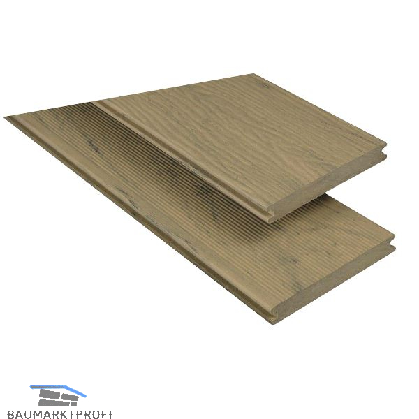Ist mit Struktur als Vollprofil erhältlich und beidseitig verlegbar. Durch die unterschiedliche Profilierung haben Sie die Wahl zwischen einer Oberfläche mit geprägter Holzmaserung oder einer klaren Linienführung (feine Riffelung).