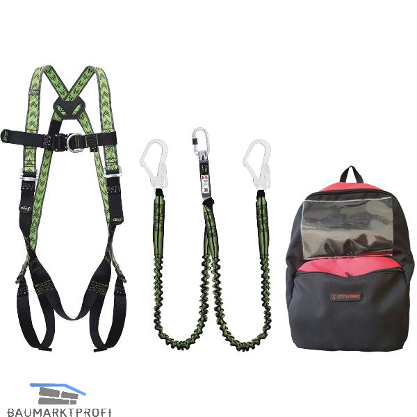 Zweipunktauffanggurt, davon 1 Verankerungspunkt mittig am Brustgurt, D-Ring für Auffangsysteme mit 3 Schnellverschluss-Schnallen. Y-Verbindungsmittel aus elastischem Gurtband mit Falldämpfer und Stahlkarabiner mit Schraubverschluss an einem Ende sowie 2 Gerüsthaken an den beidenanderen Enden.