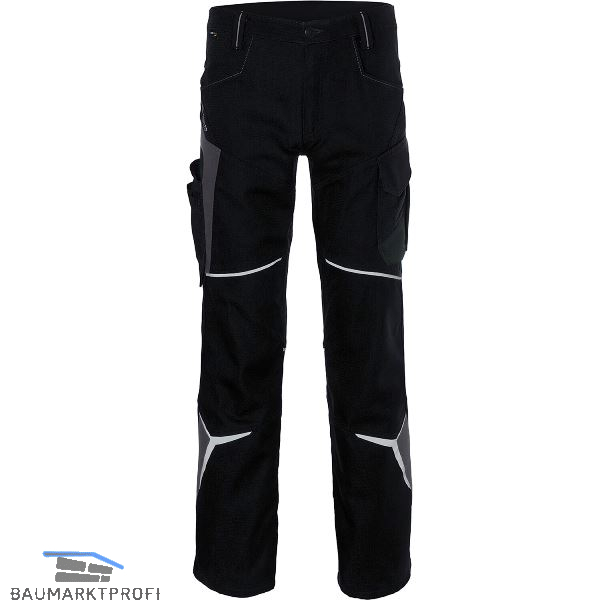 Ergonomische Linienführung für mehr Bewegungsfreiheit. 2 Seitentaschen mit großem Eingriff. 2 Gesäßtaschen mit Patte und Klette. Rechts: ergonomisch positionierte, lose, doppelte Meterstabtasche mit CORDURA®-Verstärkung und aufgesetzter Stifttasche. Links: Schenkeltasche mit Patte und Klette und CORDURA®-Verstärkung, aufgesetzte Smartphonetasche aus CORDURA®. FlexZone: elastischer Bundeinsatz und große Stretchzonen im Gesäß-, Schritt- und hinteren Beinbereich für optimale Bewegungsfreiheit. Vorgeformtes Knie mit Bewegungszone für ergonomisches Arbeiten in kniender Haltung. Innovative Gewebebindung für extreme Robustheit und besondere Optik. Belastungspunkte mit Riegeln gesichert.