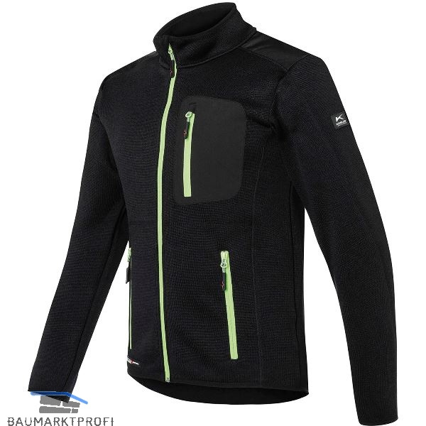 Design: Körperbetonter Schnitt. Stricklook in neuem Materialmix, melierte Optik. Kontrast-Elemente Schwarz: Schulterpasse, Reißverschlüsse, Ärmel- und Jackensaum, Brusttasche, Innenkragen, Kinn- und Windschutzblende. Funktion: 2 Seitentaschen mit gedrehtem Reißverschluss. Sichtbarer, gedrehter Frontreißverschluss mit kombinierter Kinn- und Windschutzblende. Hochschließender Kragen. Ärmel- und Jackensaum mit eingefasstem, elastischem Band. Verlängerter Rücken. Ergonomisch geschnittene Ärmel mit zusätzlicher Bewegungszone für mehr Bewegungsfreiheit. Links: Napoleontasche mit gedrehtem Reißverschluss. 2 Innentaschen. Flat-Look Nähte für druckfreies Tragegefühl. Ergonomisch geformte, griffige Zipper.