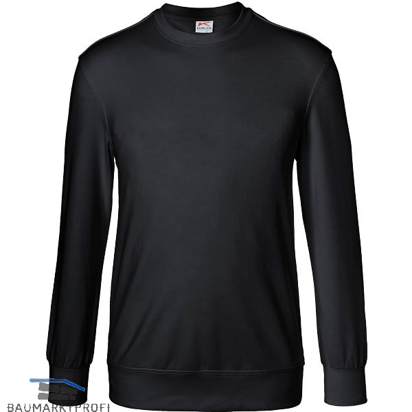 Rundhalsausschnitt mit Halsbündchen und Nackenband. Langarm. Doppelnaht an Arm- und Saumabschluss. Formstabile Ärmel- und Saumbündchen. Leasingkoller. Aufhängebänder im Saum zum Trocknen in der industriellen Wäsche. Fusselfreie Innenseite (French-Terry). Geprüft nach EN ISO 15797.