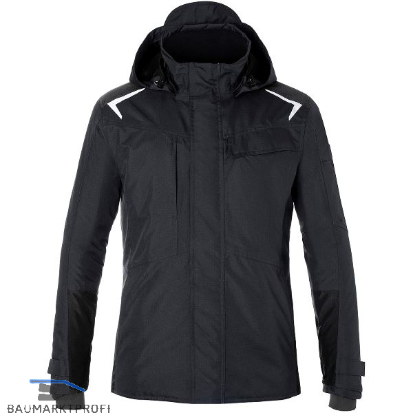 Moderne Optik durch Ripstop-Oxford-Gewebe. Kontrast-Elemente: Seiteneinsätze an Vorder- und Rückenteil, Schulter- und Ärmeleinsatz. Reflex-Elemente (Y-Wings): an Ärmel, an vorderer und hinterer Schulter. 2 abgedeckte Seitentaschen mit Reißverschluss. Rechts: Vertikale, abgedeckte Brusttasche mit Reißverschluss mit nach innen gedrehter Spirale. Links: Brusttasche mit Patte, Druckknopf und innen liegendem D-Ring. Stifttasche am Oberarm mit Drainageöffnung. Hoch schließender Kragen mit Innenkragen aus wärmendem, weichem Fleece. Abtrennbare Sturmkapuze mit Schirm, Weitenregulierung in Gesichtsfeld und Weite. Ergonomisch geschnittene Ärmel für mehr Bewegungsfreiheit. Der Ärmelsaum ist mit Druckknöpfen weitenregulierbar. Innenliegende Ärmelbündchen sowie Saugsperre an Saum und Ärmeln. 2-Wege-Frontreißverschluss mit Kinnschutz, doppelter Blende, innen mit Regenrinne und verdeckten Druckknöpfen. Tablet-Tasche und Napoleontasche unter Reißverschlussblende mit nach innen gedrehter Spirale. Innenliegende Öffnung für Kopfhörerkabel. 3D-Mesh-Einsatz im Rücken zur besseren Wärme- und Feuchtigkeitsregulierung. Ausgestattet mit wärmenden Innenfutter. Angenehme Wattierung, ca. 180 g/m², EasyBrand-Funktion durch Futteröffnung im Rücken, Leasingkoller, Verlängerter Rücken, Jackensaum mit Gummikordel weitenregulierbar, Verschweißte Nähte, Ergonomisch geformte, griffige Zipper, Belastungspunkte mit Riegeln gesichert.