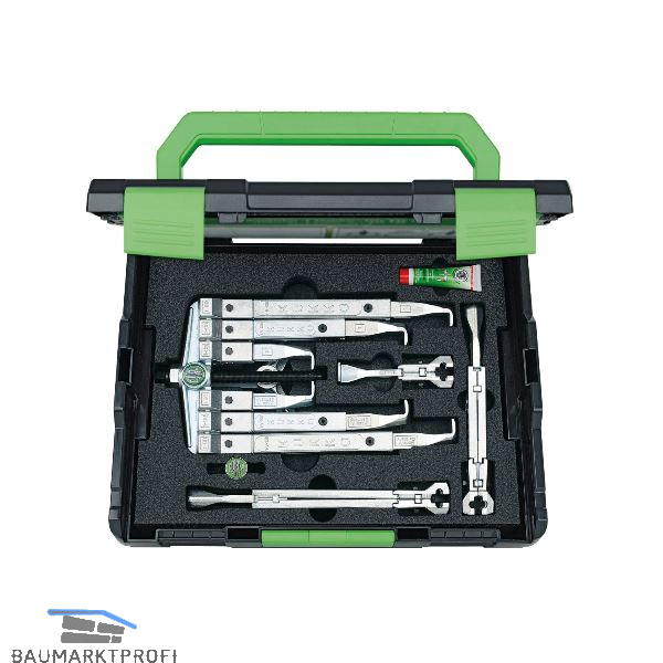 2- und 3- armiger Abzieher-Satz "8 in 1". Universelle Ausführung mit Standard-Abzughaken in mehreren Längen und zusätzlich langer Spindel. Die Zweiarmigkeit ermöglicht platzsparendes Arbeiten. Die Dreiarmigkeit garantiert gleichmäßige Lastenverteilung und dadurch besonders sicheren Halt am abzuziehenden Teil. Die Traversen besitzen ein Sechskantprofil an dem bei Bedarf ein Schlüssel zum Gegenhalten angesetzt werden kann. Universell einsetzbar, zum Abziehen von Kugellagern, Lagern, Zahnrädern etc. Durch Umdrehen der Abzughaken als Außen- und Innenabzieher verwendbar. Auch zum Abziehen asymmetrischer Werkstücke geeignet. Lieferung in L-BOXX.